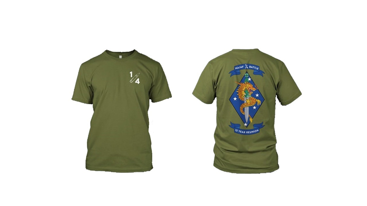 The t-shirts have a logo on the left chest and a large logo on the back. The left chest logo is typically a formal battalion, regiment, or division insignia. The back is for any company or platoon logo you may have used for your deployment.